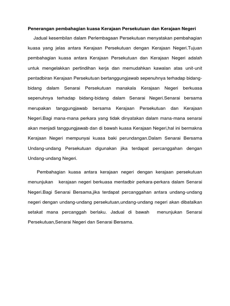 Penerangan Pembahagian Kuasa Kerajaan Persekutuan Dan Kerajaan Negeri