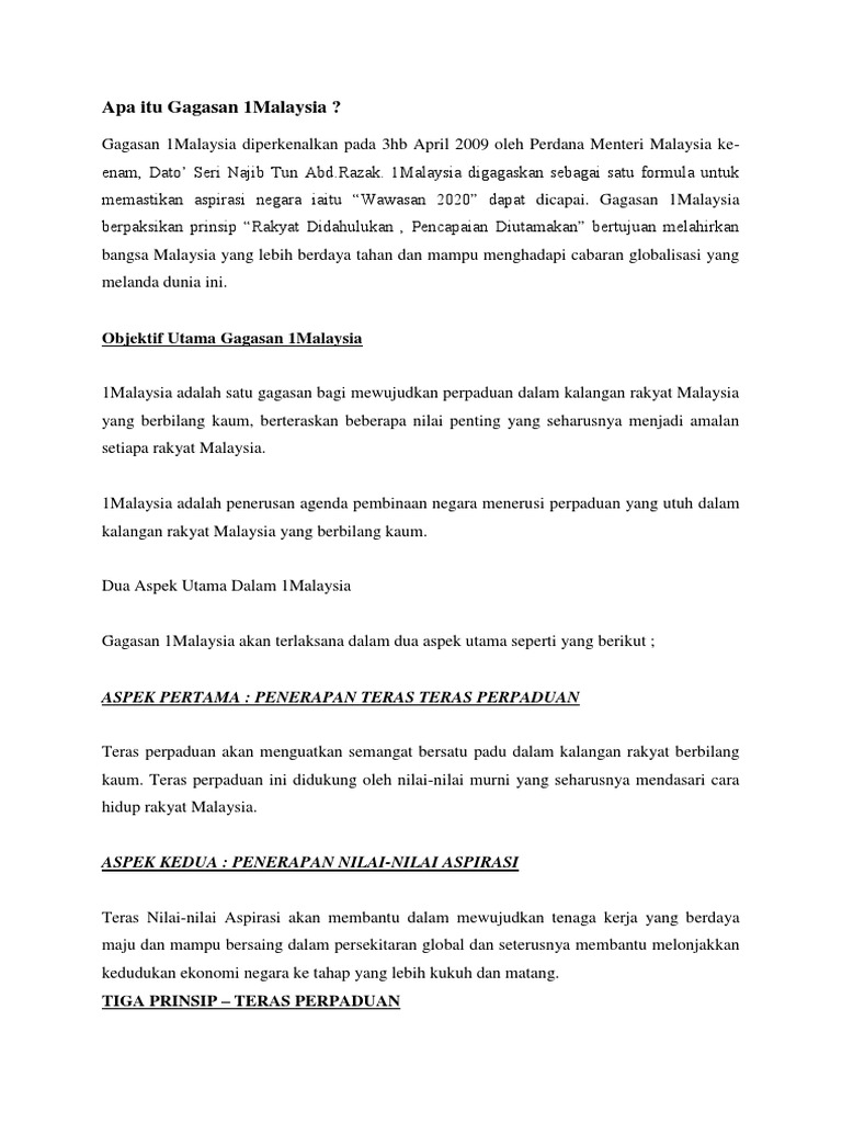 Sebaliknya konsep 1 malaysia rakyat didahulukan pencapaian diutamakan lebih merupakan satu konsep dalam bidang pentadbiran yang menyarankan pemimpin pemimpin kerajaan menjalankan tugas dengan lebih cekap amanah dan bertanggungjawab demi kepentingan rakyat. Cabaran cabaran dalam merealisasikan gagasan 1 malaysia implementasi kerajaan dalam melancarkan dan melaksanakan konsep 1malaysia sememangnya merupakan suatu inisiatif yang baik namun bolehdikatakan strategi dan pelan tindakan mereka tidak begitu memuaskan mengenai usaha untuk mendidik dan menyemai perasaan kekitaan melalui konsep 1malaysia bukannya mudah. Perbezaan antara konsep 1malaysia dengan konsep malaysian malaysia berpandukan definisi konsep 1malaysia yang dinyatakan di atas konsep 1malaysia memiliki kelainan seperti berikut. Sebaliknya konsep 1 malaysia rakyat didahulukan pencapaian diutamakan lebih merupakan satu konsep dalam bidang pentadbiran yang menyarankan pemimpin pemimpin kerajaan menjalankan tugas dengan lebih cekap amanah dan bertanggungjawab demi kepentingan rakyat.