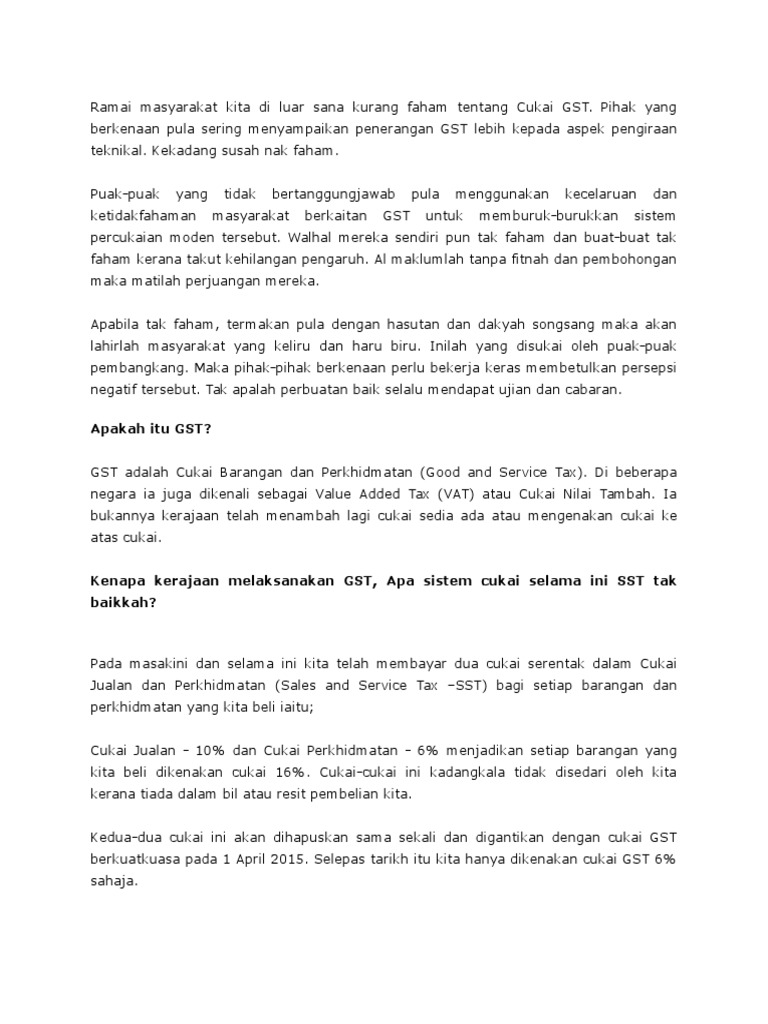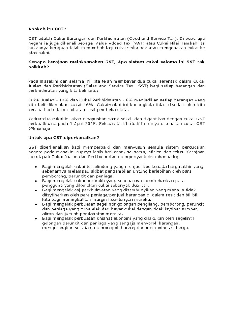 Diperkenalkan untuk menggantikan akta cukai jualan dan perkhidmatan 2014. Cukai jualan minyak pada. Dalam ucapan bajet 2014 pelaksanaan cukai barangan dan perkhidmatan gst mungkin merupakan topik yang paling diberi perhatian. Panduan umum cukai jualan pada 25 ogos 2018 ditarik balik dan digantikan dengan panduan umum cukai jualan yang dikemaskini pada 7 september 2018.