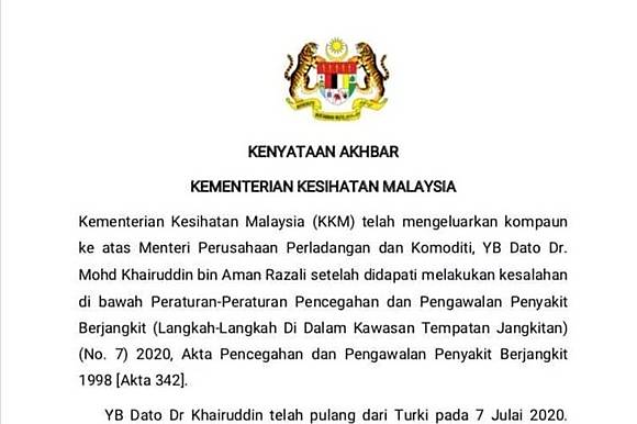 Langgar Karantina Menteri Perladangan Malaysia Didenda Rp 3 5 Juta