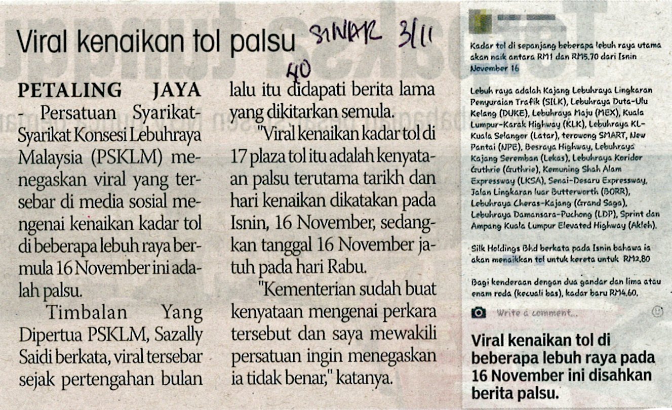 Kkr Malaysia V Twitter Psklm Tegaskan Viral Yg Tersebar Di Media Sosial Mengenai Kenaikan Kadar Tol Pd 16 Nov Adalah Palsu Sinar Harian 3 11 2016 Llminfotrafik Https T Co Seewn8shfu