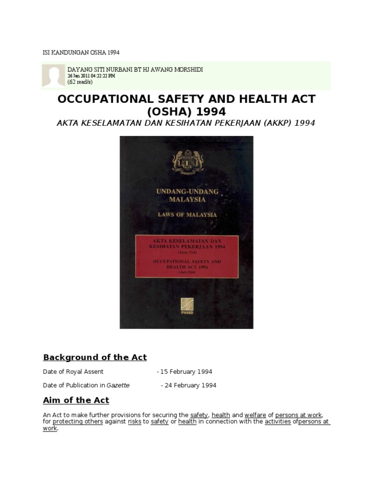 Isi Kandungan Osha 1994 Occupational Safety And Health Labour Relations
