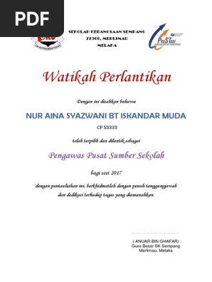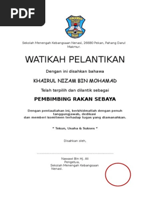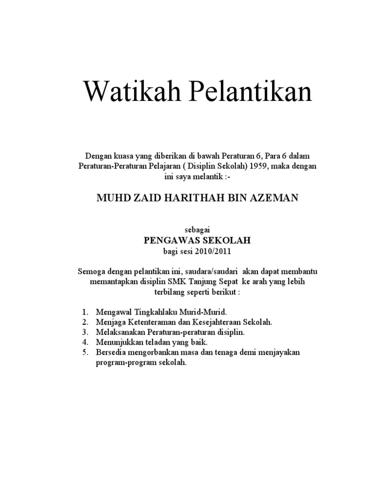 Aris program kpi ceramah sambutan maulidur rasul 2012 bantuan mangsa kebakaran majlis penyampaian watikah pelantikan pengawas pro kesedaran kepimpinan sekolah bebas dadah lawatan penanda aras ke kantin smk j f lawatan ke rumah pelajar 1 lawatan ke rumah pelajar 2 program pautan kasih sambutan hari guru 2012 modul matematik pmr 2012. Human translations with examples. Macmillan credentials appointment handover ceremony appointment letter. Watikah pelantikan pengawas 2011 watikah pelantikan telah diadakan setiap tahun seperti tahun tahun sebelumnya dengan pelaksanaan majlis diadakan dengan ceramah motivasi bidang tugas dan pelbagai input untuk menjadi pemimpin dalam sekolah.